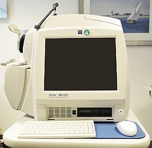 Optische Kohärenz Tomographie (OCT) – Das Gerät erstellt Netzhautschichtbilder in höchster Qualität und ermöglicht bei schmerzfreier Untersuchung eine deutlich verbesserte Beurteilung von Makula (“Netzhaut”), Nervenfaserschicht und Sehnervenkopf und dient der Verlaufskontrolle.